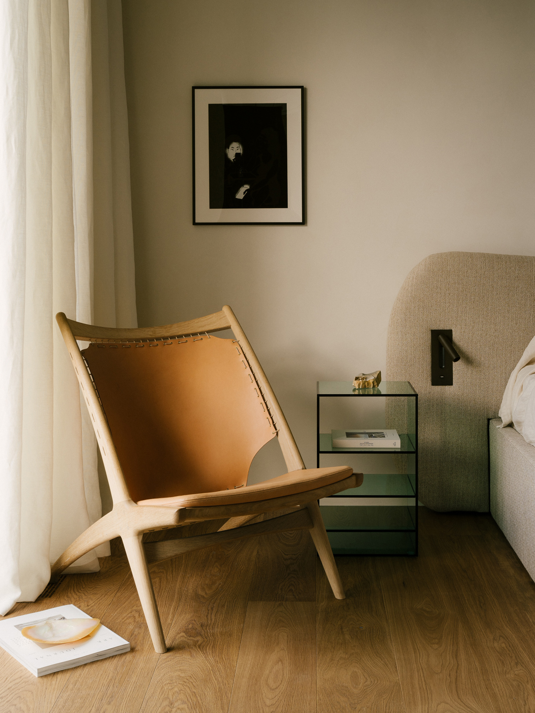 At the heart of the living area is a vintage sofa upholstered with premium Kvadrat fabric, which beautifully contrasts with custom-made wooden furniture. The design strikes a balance between art and functionality, featuring a handcrafted cork coffee table and a bespoke dining table as standout elements.